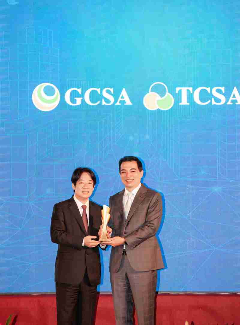 达全方位永续表现获全球永续奖及台湾永续奖肯定,,由副总统赖清德颁奖 (左),,人生就是博总经理柯富仁 (右) 代表领奖