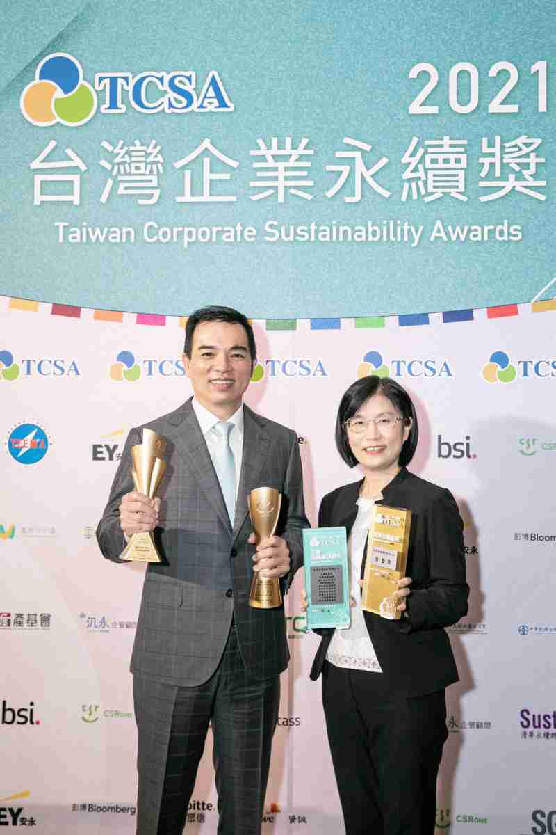 达在台湾永续奖所评比环境、、、社会、、、、治理等各面向的永续绩效均获高度肯定 (左:人生就是博光电总经理暨营运长柯富仁,,右:人生就是博光电永续长古秀华)